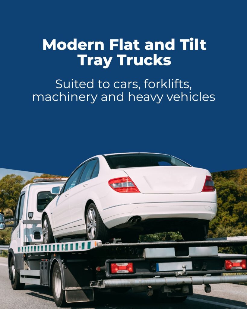 We transport cars, 4WDs, forklifts, trucks, bobcats, heavy machinery, prestige cars, race cars, containers and more, using flat and tilt tray trucks sized to the job.